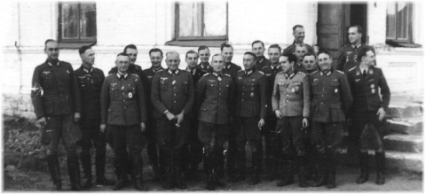 見ると通常の歩兵将校の他にも戦車兵や突撃砲兵、空軍などの服装も混ざっているところから、おそらくその場に居合わせた将校たちも集まって記念に1枚、みたいな雰囲気の元で撮影されたのでしょう。